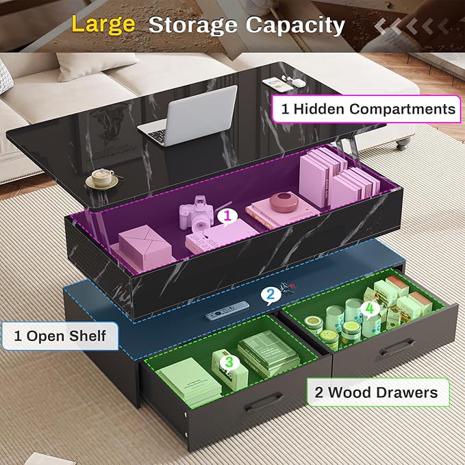 - 【What you get?】The lift top coffee table with 2 using methods also has hidden storage compartment, an open storage shelf, 2 drawers and LED light. Coffee tables for living room can be used when eating, working, studying and playing games, quietly and easily lift the table top to facilitate small room to make full use of the space.