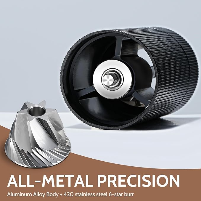 - Durable All-Metal Build: This portable coffee grinder features a high-strength aluminum alloy body with a single 420 stainless steel conical burr. Its all-metal design ensures stable grinding and enhanced durability, enough for daily use