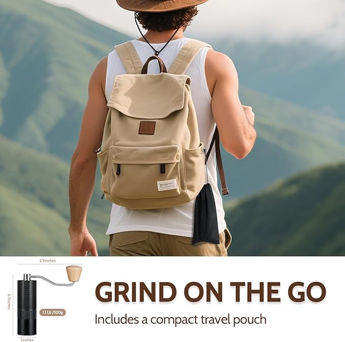 - Compact & Travel-Ready: This travel coffee grinder measures 6.1 x 2 inches and features a 20g capacity—enough for a single cup of coffee. It's lightweight, space-saving, and comes with a black storage pouch, making it ideal for camping, hiking, or enjoying fresh coffee on the go