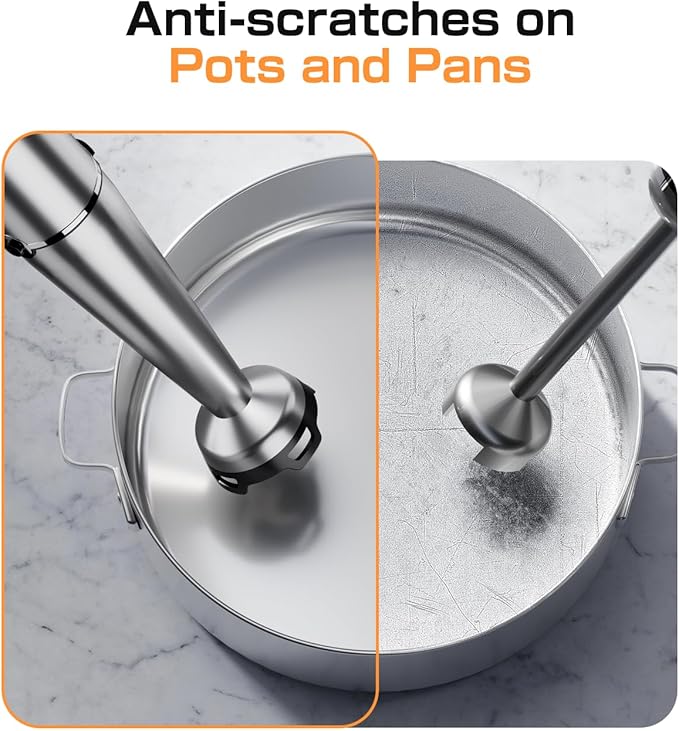 - Effortless Clean-Up, Scratch-Free: Features a unique food-grade nylon blade guard designed to minimize suction, preventing scratches on your pots and pans and keeping splashes at bay for a cleaner kitchen and hassle-free clean-up.