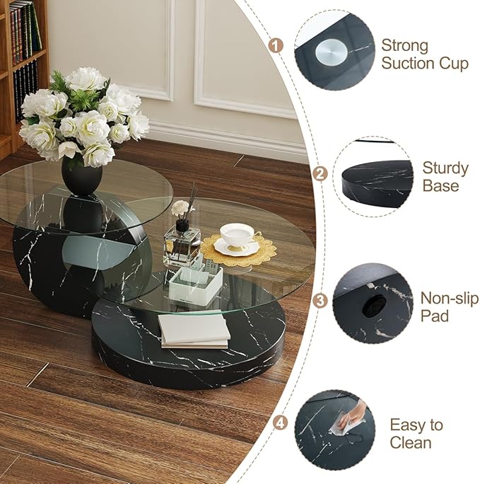 - 1. Ultra-Safe Tempered Glass Top:This coffee tables for living room is durable,Engineered with 0.3-inch thickened safety glass, this glass tabletop withstands up to 200-300 lbs. Its impact-resistant, scratch-proof surface shrugs off daily chaos, while rounded corners prevent bumps and bruises.