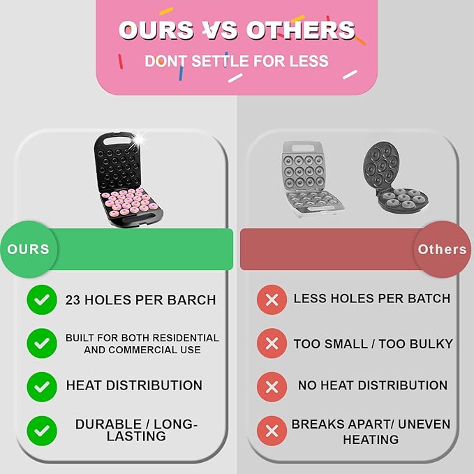 - Make 23 Mini Donuts at Once: Save time and bake more! Our electric mini donut maker cooks up to 23 perfectly shaped mini doughnuts in just minutes — ideal for breakfast, snacks, or parties.