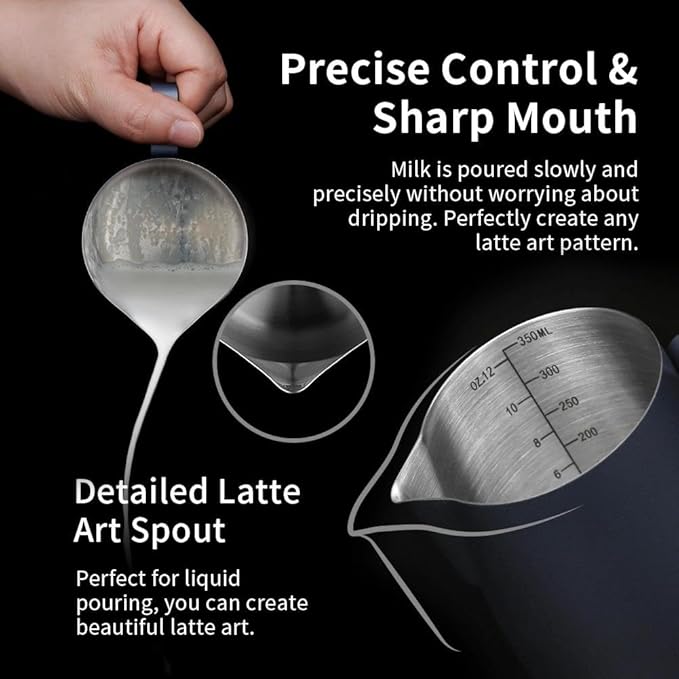 - INSIDE SCALE LINES MEASURING: The milk pitcher has clear inside measurement lines(ml/oz), making it easier to control the amount of milk or cream per cup of coffee. 12/20/32/50oz milk frother pitcher can satisfied your different demands. Ideal for foaming or steaming milk, used in espresso and cappuccinos, it can be used for any liquid measuring like water, juices, batter mixes, smoothies etc.