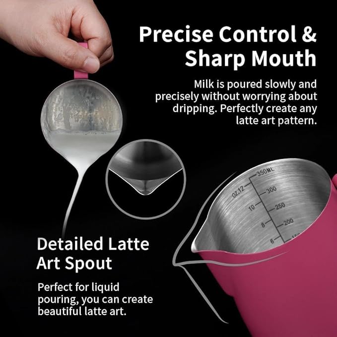 - DRIPLESS SPOUT DESIGN: The dripless spout allows you pour milk foam smoothly and precisely without dripping. You can practice and create your own beautiful latte artwork easily!