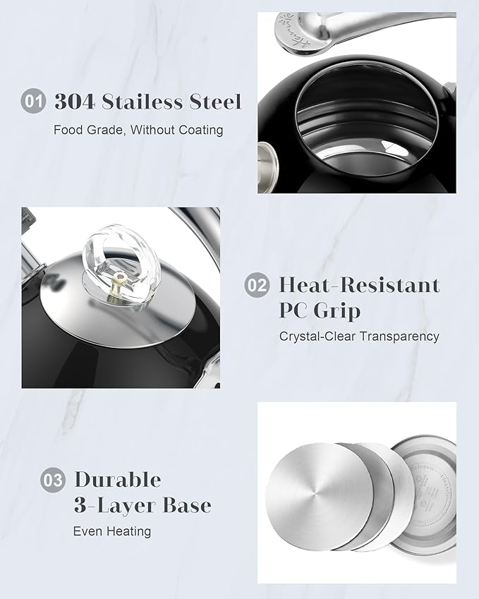 - Premium 304 Stainless Steel Body: Rust-proof construction ensures durability, Our tea kettle can safely withstands high heat without degradation. The internal small silicone gasket is FDA food grade and does not come into contact with water, which is safe and reliable