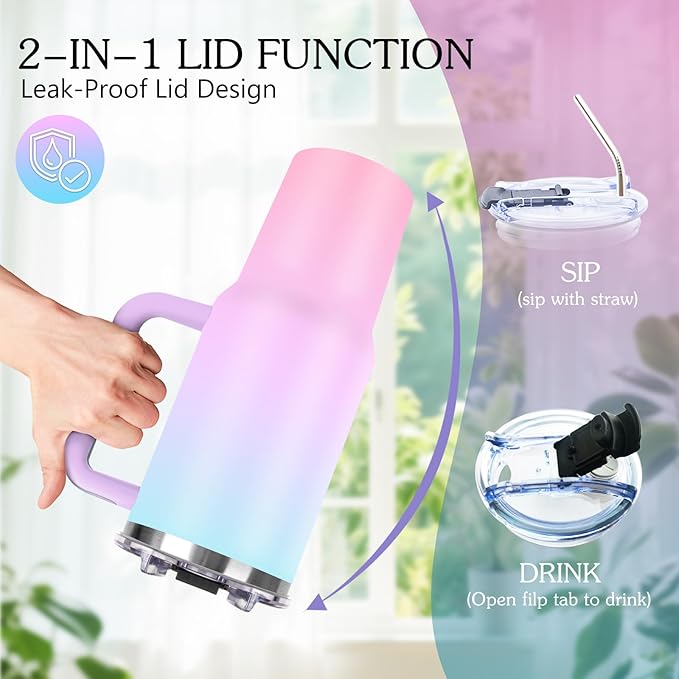 - 【Comfortable & Convenient】This 40 oz tumbler with handle and straw is perfect for everyday drinking. Whether it's office work, home leisure, outdoor sports, fitness exercise, or driving, its large capacity design and excellent insulation performance ensure that you don't need to add water within 5 hours, allowing you to enjoy beverages with suitable temperature anytime, anywhere.