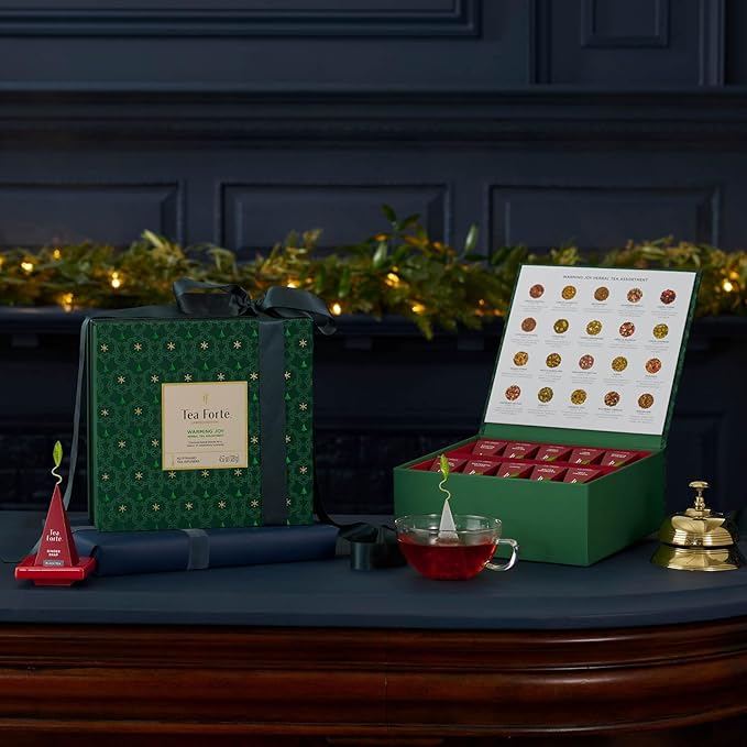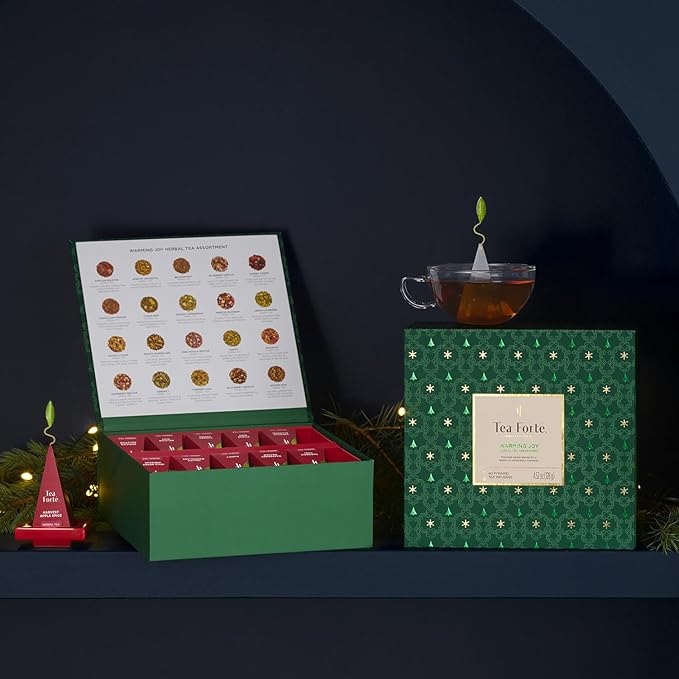 Tea Forte Warming Joy Holiday Herbal Premium Tea Chest Gift Sampler, 40 Count, 2 of each Variety Blend Individually Wrapped Handcrafted Pyramid Infuser Bags