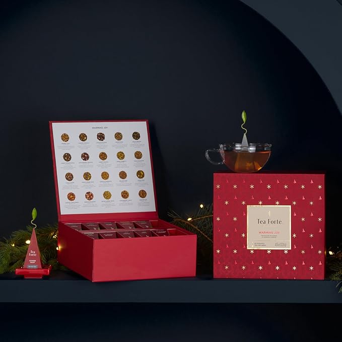 Tea Forte Warming Joy Holiday Assorted Premium Tea Chest Gift Sampler, 40 Count, 2 of each Variety Blend Individually Wrapped Handcrafted Pyramid Infuser Bags