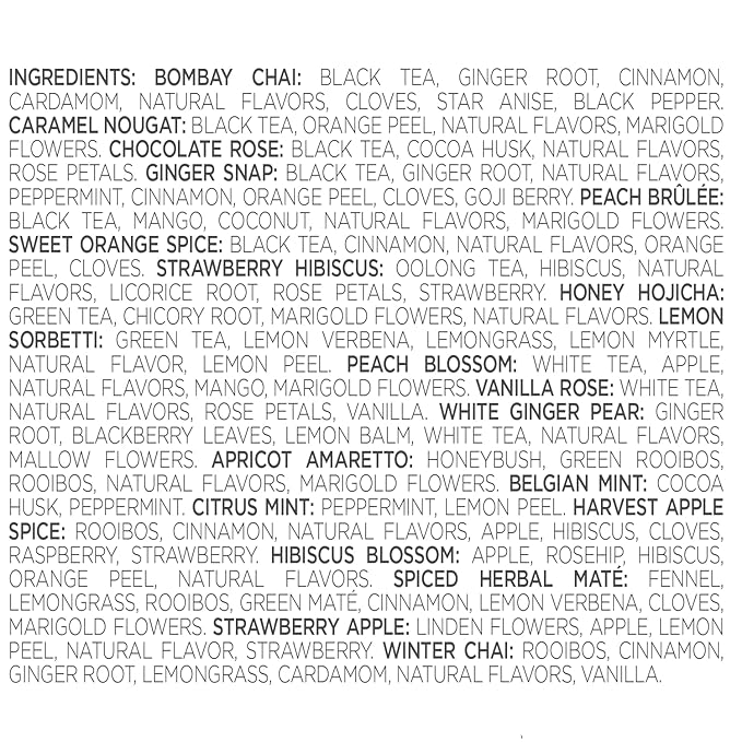 - TEA BLENDS - 40 pyramid infusers with 2 of each blend: Bombay Chai (black), Caramel Nougat (black), Chocolate Rose (black), Ginger Snap (black), Peach Brulee (black), Sweet Orange Spice (black), Strawberry Hibiscus (oolong), Honey Hojicha (green), Lemon Sorbetti (green), Peach Blossom (white), Vanilla Rose (white), White Ginger Pear (white), Apricot Amaretto (herbal), Belgian Mint (herbal), Citrus Mint (herbal), Harvest Apple Spice (herbal), Hibiscus Blossom (herbal), Spiced Herbal Mate (herbal), Strawberry Apple (herbal), Winter Chai (herbal).