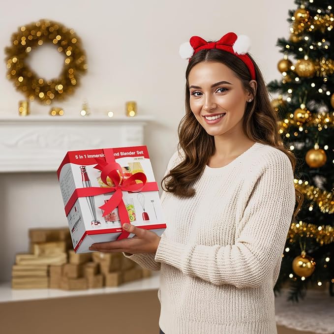 Immersion Blender Handheld Corded Hand Blenders Set 1100W, Trigger Variable Speed 5 in 1 Stick Emulsifier with Chopper, Whisk and Frother for Soup, Baby Food and Smoothies, Red