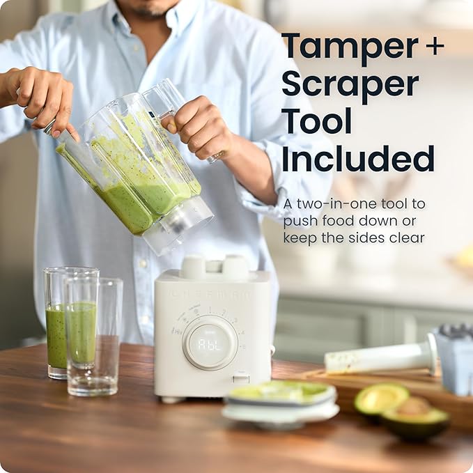 - ACCESSORIES INCLUDED: Everything you need for this one-stop blender mixer. Purchase includes a 2-in-1 tamper and scraper tool to tackle any blending challenge. The lid features a BPA free cover which doubles as a 1 oz liquid measuring cup.