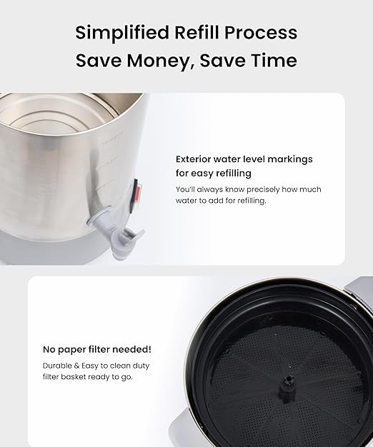 - User-Friendly: Clear coffee level markings inside the urn make filling and refilling simple and convenient. No need to guess when it's time for another batch