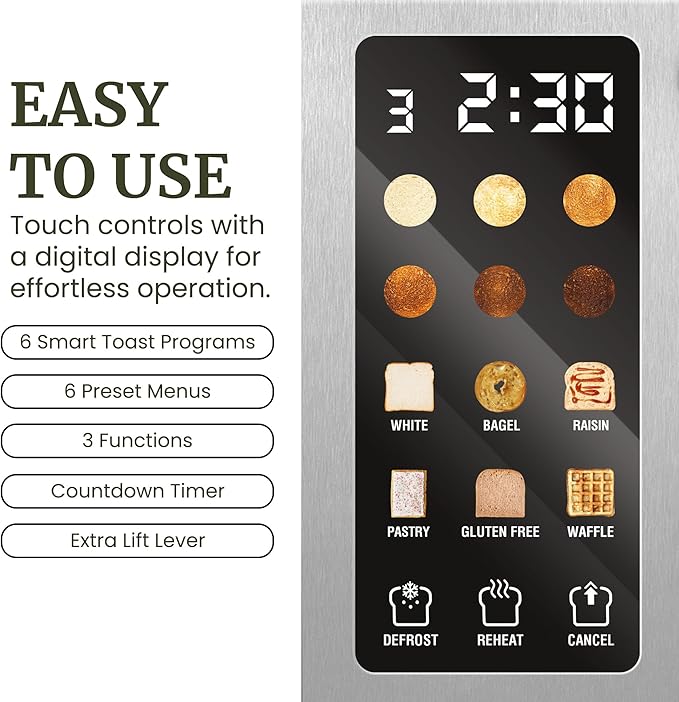 Elite Gourmet ECT2899 LCD Touch Toaster, 2 Extra-Wide Slots, 6 Toast Shades, 6 Preset Menus Including Bagel Waffle Gluten-Free, Defrost Reheat Cancel Functions, Stainless Steel