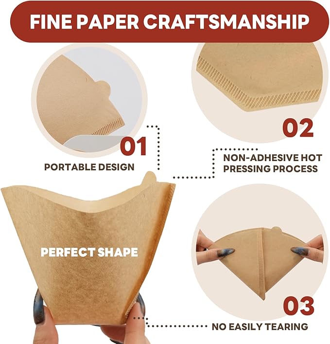 - Tough Hot-pressed Edge Technology: The paper coffee filter is heat-pressed to ensure a balanced fiber distribution and paper thickness, preventing the cone coffee filter from cracking or collapsing during brewing, ensuring reliable and consistent dripping effect every time. It reduces damage to the original flavor, health, and hygiene of the coffee, making it more secure to use.