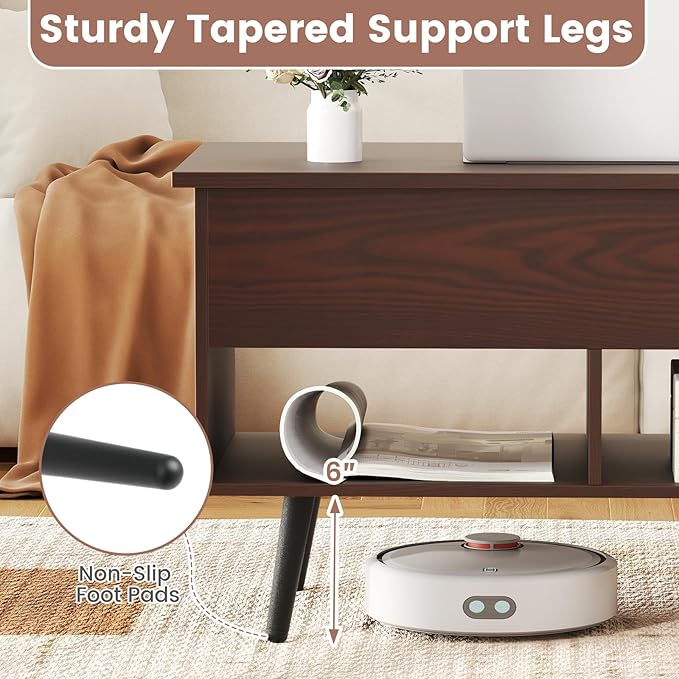 - Reliable Construction: The lift top coffee table is a firm and well made piece. Made of thicken engineered wood and MDF, this center table is sturdy enough to hold up to 132 lbs in total. Solid wood legs also provide reliable support and non-slip foot pads protect the floor from scratches.