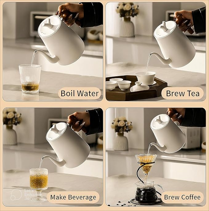 [UPGRADED] Gooseneck Electric Kettle, 1L Stainless Steel, Wooden Handle Electric Kettle, Auto Shut-Off,Precise Temperature Control for Pour Over,Hot water, Coffee & Tea| US Versioin| White