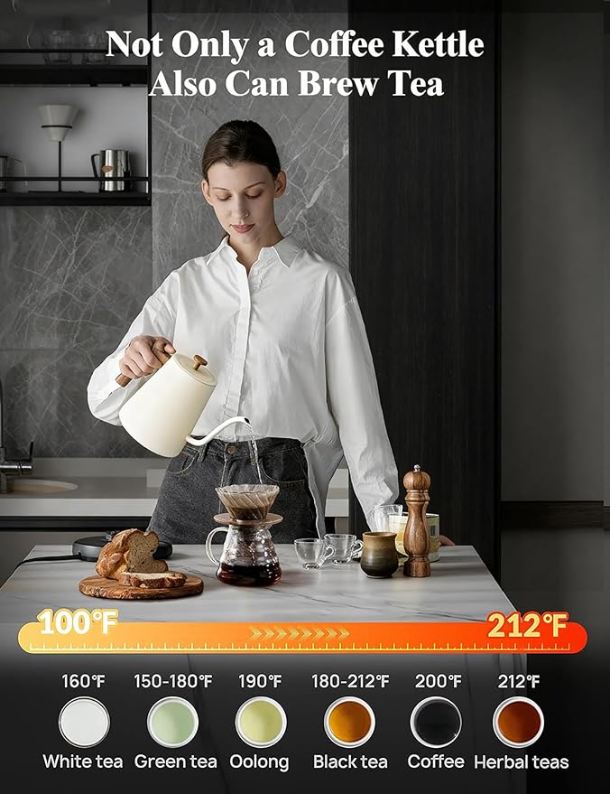 - ACCURATE TEMP CONTROL KNOB: The temperature of the electric kettle gooseneck can be adjusted quickly and accurately by rotating the knob, You can set the temperature in 1-degree increments between 100℉-212℉(38℃-100℃). Meet different coffee and tea extraction requirements