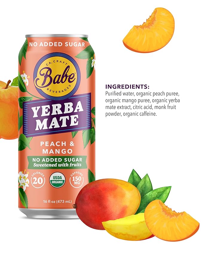 Babe Organic Yerba Mate Energy Drinks | NO SUGAR ADDED with 150mg Plant-Based Caffeine | Natural Yerba Mate Tea with No Crash, No Jitters - Peach Mango (12 x 16oz Cans)