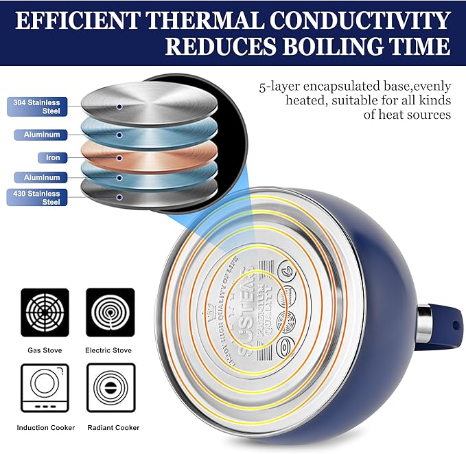 - INNOVATIVE BOTTOM BOILS WATER FASTER - SUSTEAS tea kettle is made of 5 layers encapsulated bottom, which improves heating performance while reducing heat loss, greatly shortening boiling time. It is compatible with all types of cooktops, including induction, gas, electric, halogen and radiant cooktops. You can enjoy a premium quality cup of tea or coffee at home