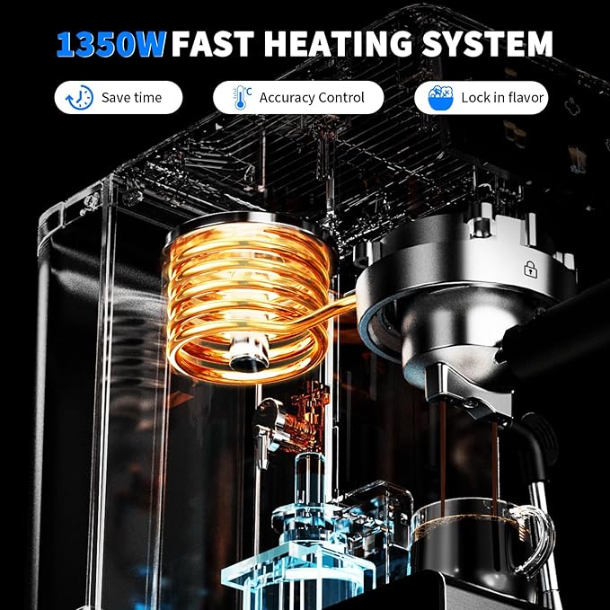 - Professional 20-Bar Pressure System:Powered by an authentic Italian-made 20-bar pump and a high-performance 1350W boiler, our semi-automatic espresso machine ensures precision brewing. The advanced pre-infusion function gently pre-wets the coffee grounds for balanced extraction, unlocking richer flavors and a fuller aroma. Experience consistently smooth, aromatic espresso with a velvety crema—every time.