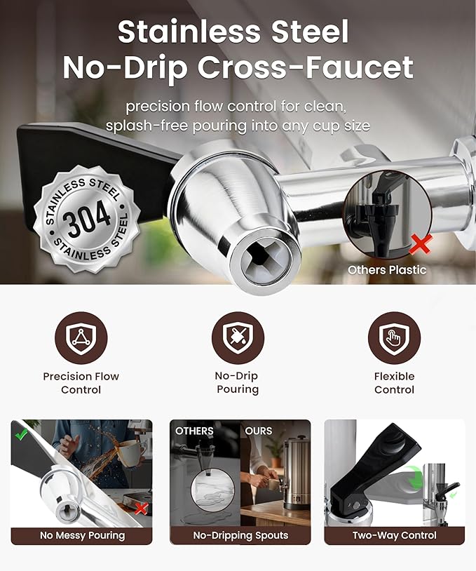 - ๐๐ฎ๐ซ๐๐๐ฅ๐ ๐๐ญ๐๐ข๐ง๐ฅ๐๐ฌ๐ฌ ๐๐ญ๐๐๐ฅ ๐๐จ-๐๐ซ๐ข๐ฉ ๐๐ซ๐จ๐ฌ๐ฌ-๐ ๐๐ฎ๐๐๐ญ: Equipped with a heavy-duty all-stainless steel faucet and cross-shaped spout, AZZO 50 cup coffee maker delivers superior durability, safety, and hygiene compared to common plastic faucets. The no-drip design with precise flow control ensures clean, splash-free, and drip-free pouring into cups of any size.