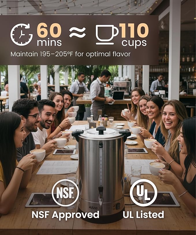 - ๐๐ข๐ ๐ก-๐๐๐ซ๐๐จ๐ซ๐ฆ๐๐ง๐๐ ๐๐๐๐๐ ๐๐๐ฉ๐ข๐ ๐๐ซ๐๐ฐ ๐๐ฒ๐ฌ๐ญ๐๐ฆ: Equipped with a powerful 1500W heating element, AZZO large percolator coffee pot delivers up to 110 cups (5oz each / 16L) in just 60 minutes. The coffee pot designed for high-demand environments such as catering, weddings, buffets, offices, hotels, meeting rooms, cafes, outdoor events, Shabbat, and church gatherings, ensuring reliable performance for both large and small occasions.