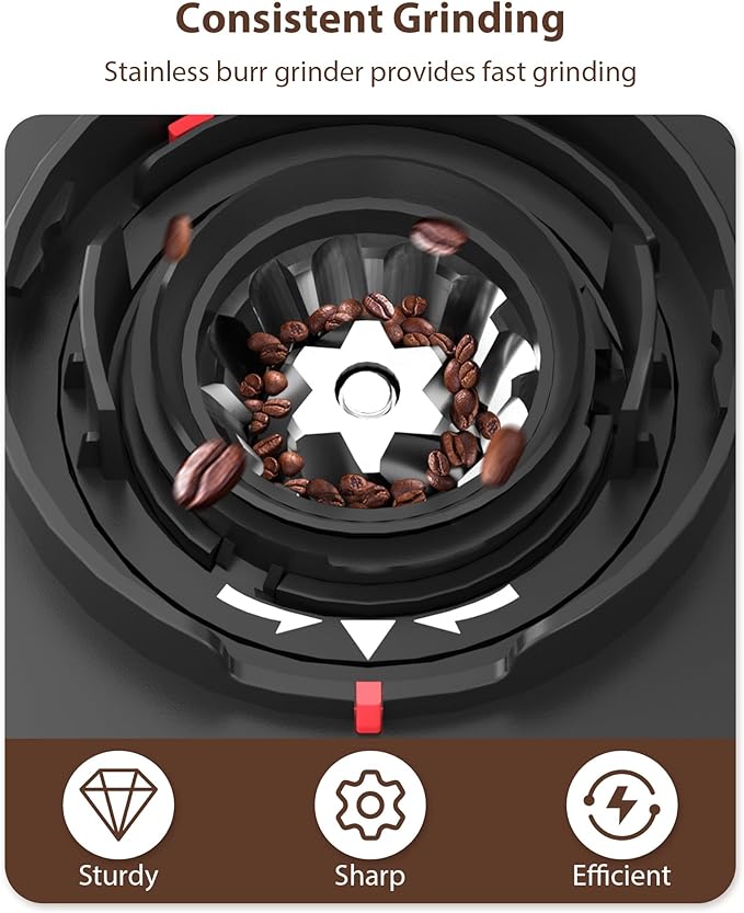 - [Stainless Conical Burr & Easy to Clean] : High-quality conical burr provides uniform and precise grinding, resulting in an optimal coffee extraction process. The removable upper burr, hopper, chamber, and included brush make it easy to clean.NOTE:The brush is behind the bean bin lid.