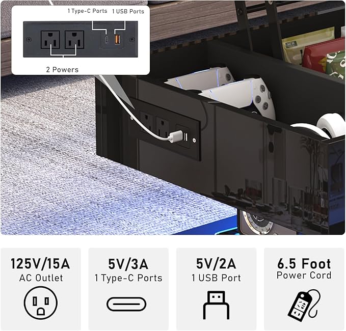 - With Practical Power Outlet: led coffee table desktop have 2 USB ports, 2 AC power outlets and a long 6.5FT power cord, providing unparalleled convenience for charging your basic devices such as computer, mobile phones and game consoles.Check all the accessories laying flat on the floor before assembly, then follow the instructions for quick assembly.