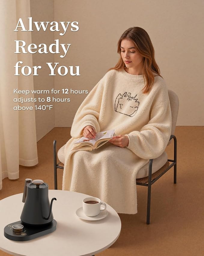 - 7 PRESETS & 12-HOUR KEEP-WARM FUNCTION: Select from 7 optimized presets for green tea, pour-over, oolong, and more. With one tap, activate Keep-Warm to hold your chosen heat for up to 12 hours (auto-adjusts to 8 hours above 140°F). This electric tea kettle maintains your ideal temperature for any brew. Always the right temp, anytime