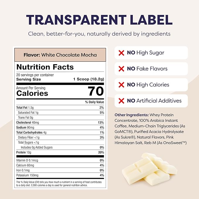 White Chocolate Mocha Protein Iced Coffee - Premium Whey Protein & Instant Iced Coffees - 100% Natural Cold Brew Coffee - Zero Artificial Flavors & Sweeteners, 80 mg Caffeine, 0g of Sugar, 20 Servings