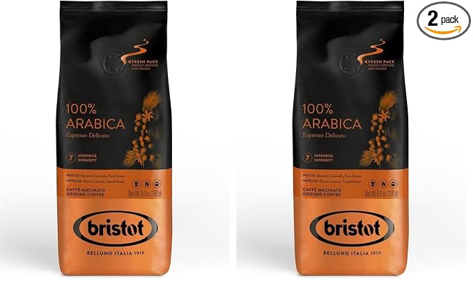 Bristot 100% Arabica Ground Coffee – Italian Espresso Delicato – Medium Roast – Ground Coffee for Moka Pot, French Press & Pour Over – 8.8oz (250g) (Pack of 2)