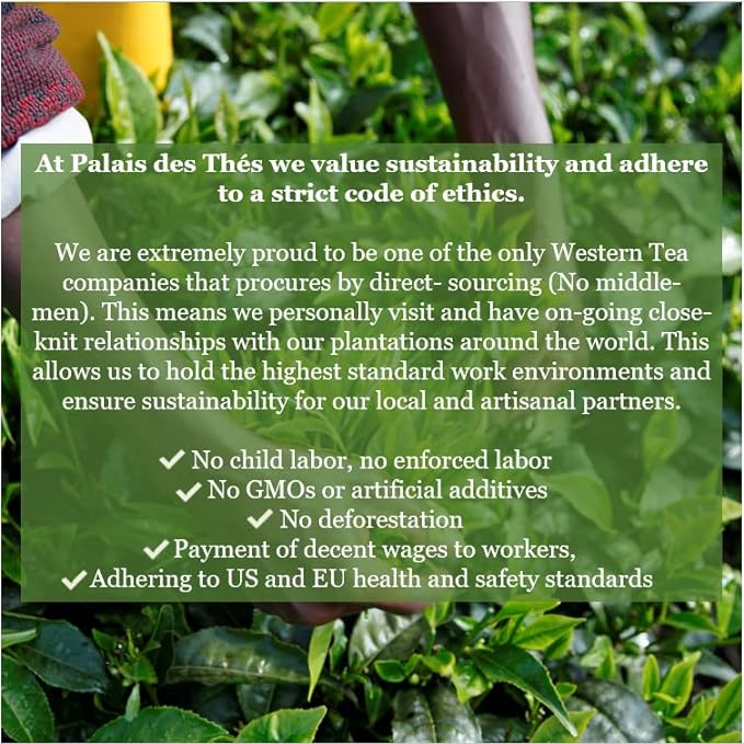 - ETHICAL SOURCING - Having cultivated a personal relationship with tea producers, Palais des Thés has been able to engage in direct sourcing. Working on the ground without middlemen has allowed us to offer rarer, fresher, more varied teas. This tight-knit relationship valuing respect, integrity and responsibility is also essential in our commitment to being a clean brand.