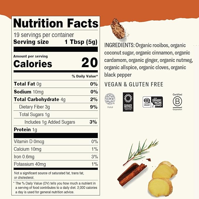 - Nourishing blend in every cup: made with organic rooibos and real chai tea spices; 1g protein and fiber per serving; wholesome ingredients that restore, comfort, and naturally uplift the body