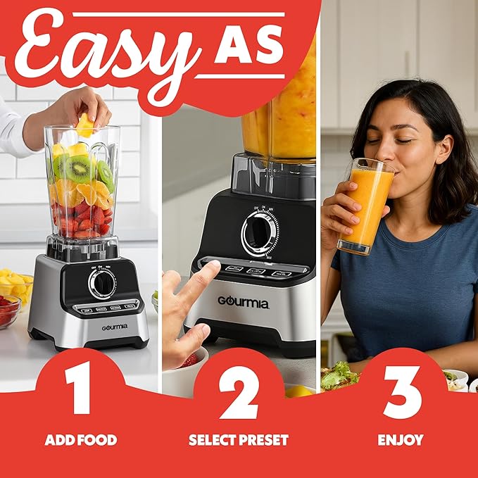 Gourmia Heavy Duty Countertop Blender – 2L BPA-Free Pitcher, 1500W High-Speed Motor, 45,000 RPM, 4 Presets, Variable Speed Dial, Built-In Tamper, Dishwasher-Safe Parts, Stainless Steel