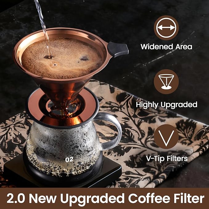 - 💎【Reusable Stainless Steel Pour Over Drip Coffee Filter】Made of premium 304stainless steel, featuring extra-fine dual mesh for precise filtration -nopaper filters, no waste.