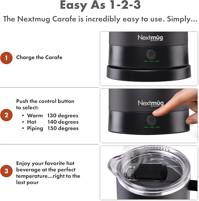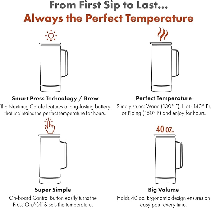 - THE PERFECT TEMPERATURE – The Nextmug Carafe will hold your hot beverage at its temperature for hours. Simply select Warm (130° F), Hot (140° F), or Piping (150° F) and enjoy for hours.